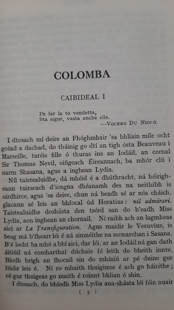 This is an Irish language a translation of a story by Prosper Mérimée. This translation was published by An Gúm in 1929.