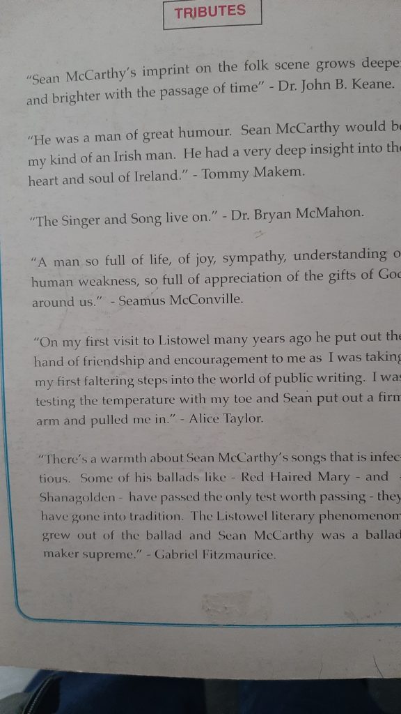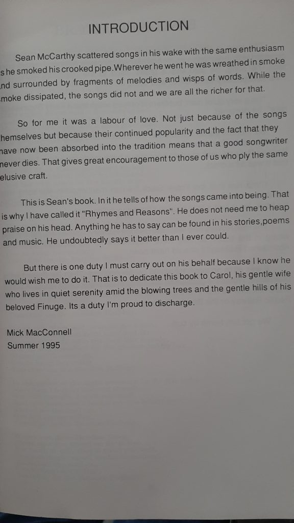 This book was published Sean McCarthy Memorial Committee.  Every year the citizens of Finuge celebrate Sean’s life. The book is a celebration of the songs of Sean McCarthy and the stories that inspired them.