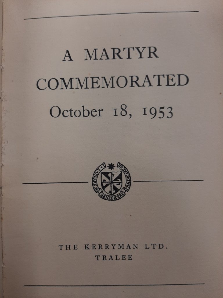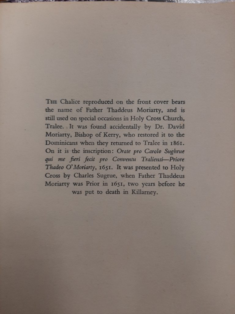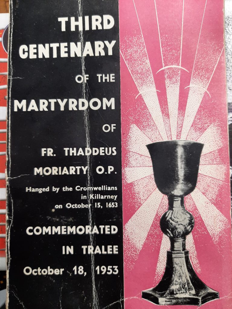 This booklet was published by the Dominican Community in Tralee in 1953 to commemorate the death of Fr Moriarty on 18th October 1653. Fr Moriarty was hanged by Cromwellian forces in Killarney on that date.