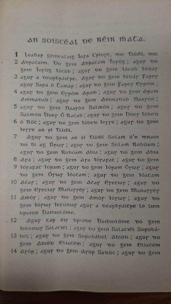 The book was printed using the old Gaelic font. and the style of Irish that was in vogue at that time.